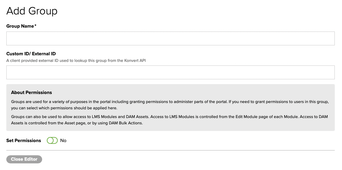No Custom Permissions Needed: Leave the Set Permissions toggle unchecked. Users in this group will be able to view basic parts of the portal, such as assigned modules and/or assets.