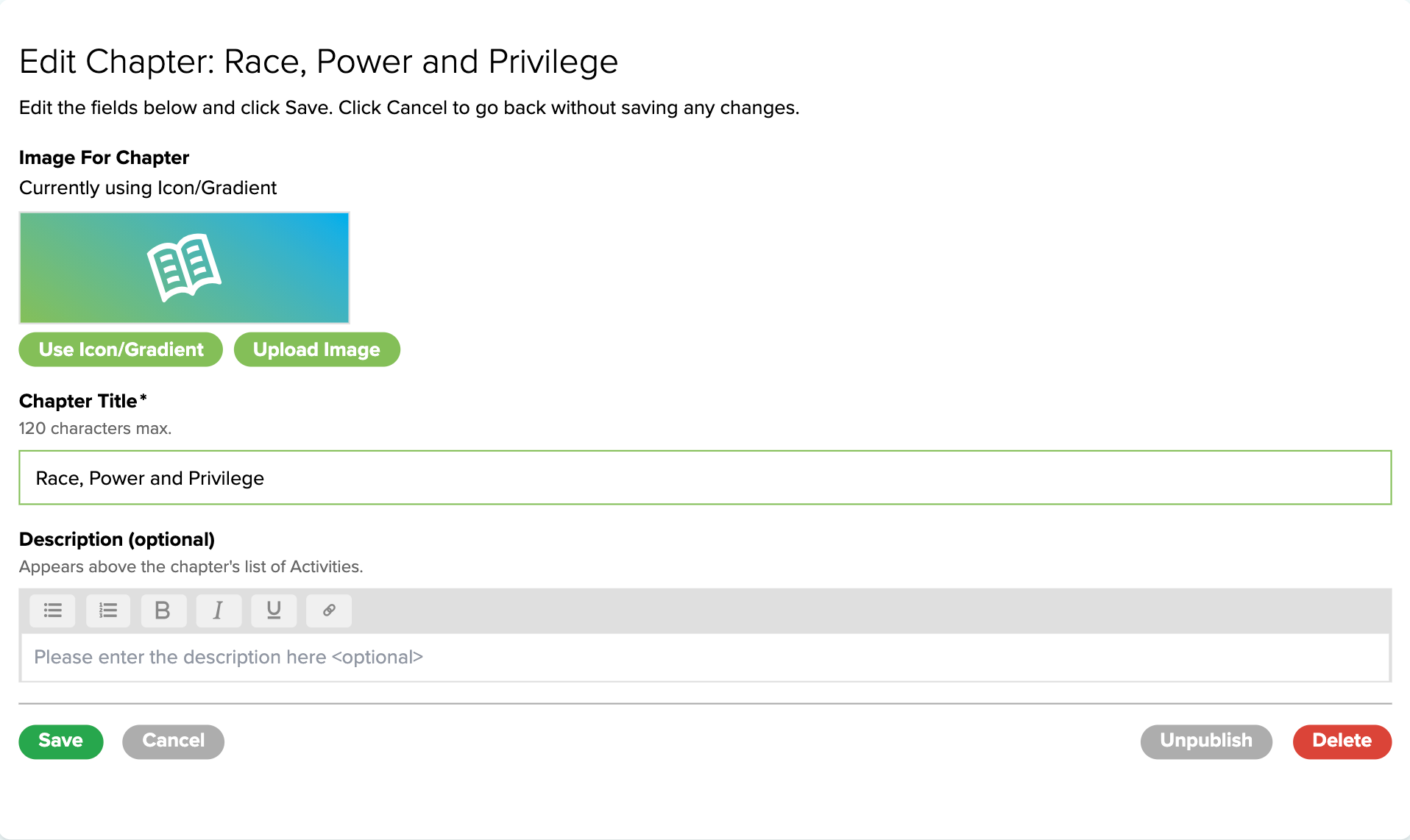 Chapter Image: Upload an image or use the icon with a solid or gradient background color, if chapter images are enabled on the Course Editor page.