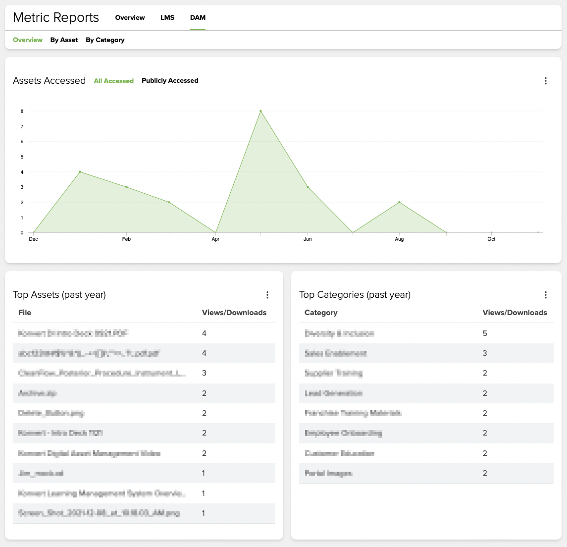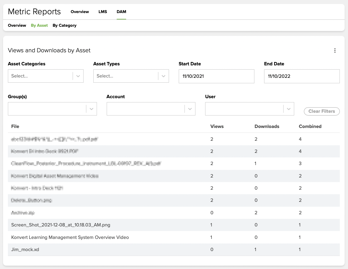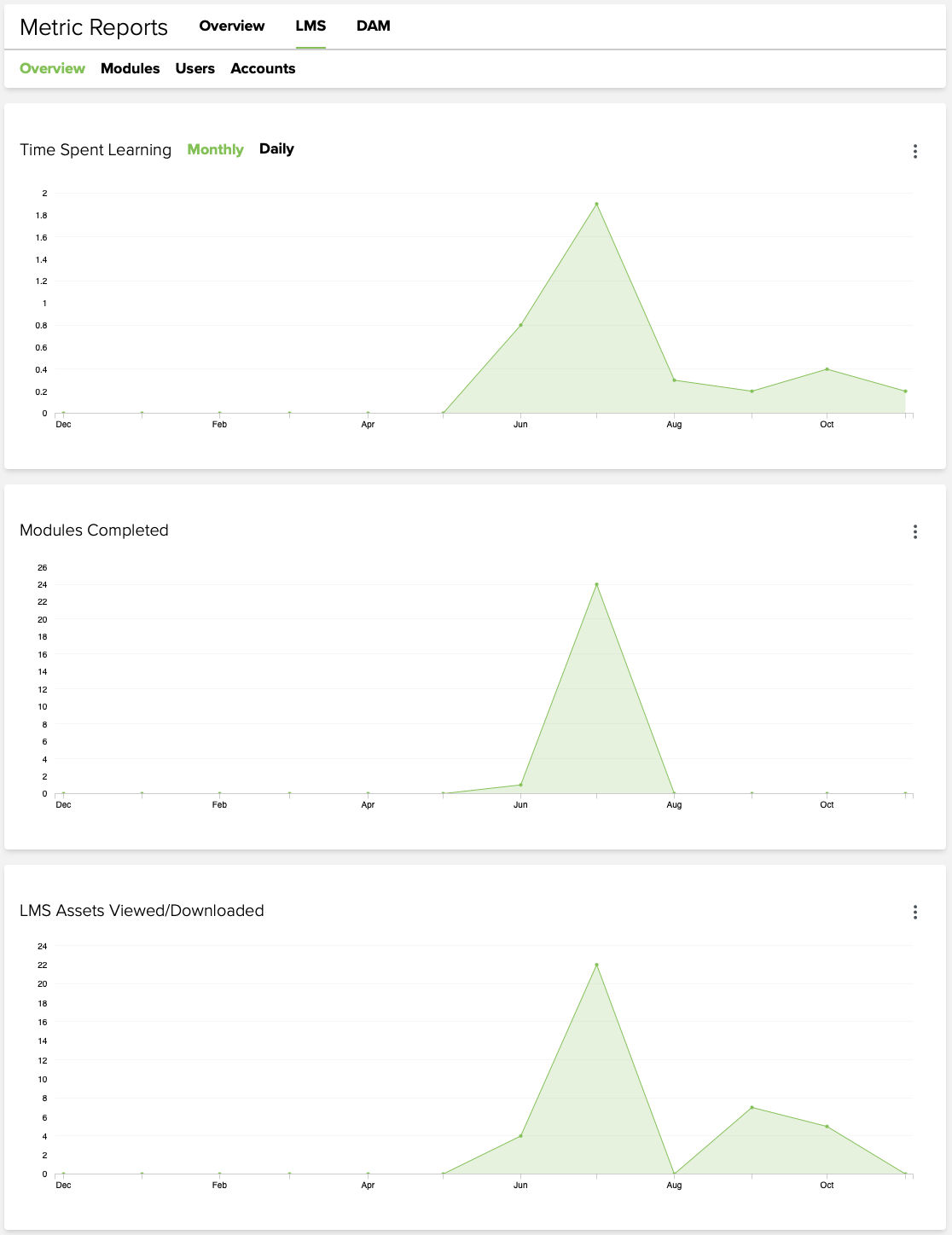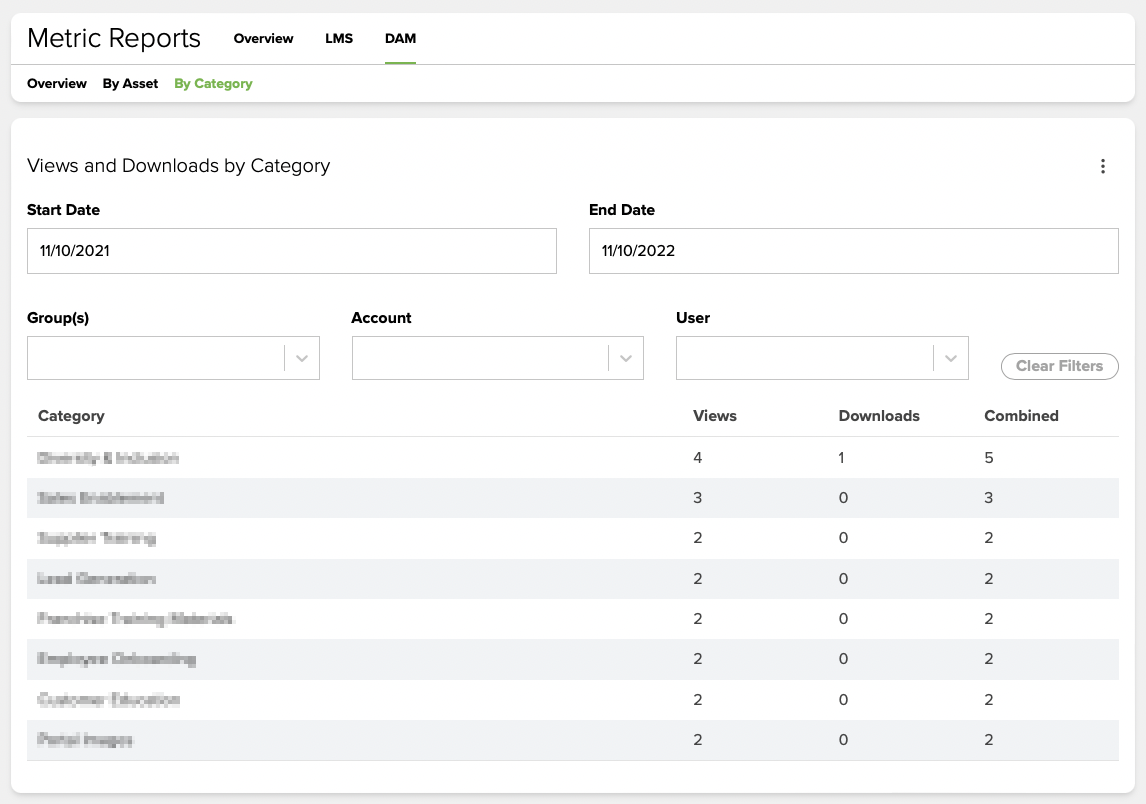 In the Metric Reports navigation bar above the data tables, you can click LMS or DAM to view the data for your Learning Management System (LMS) or Digital Asset Management (DAM) platform. The LMS section allows you to view and download LMS overview data and data on modules, users, and accounts. The DAM section will enable you to view and download DAM overview data (asset access counts, top assets, and top categories) and metrics by Asset and by Category.
