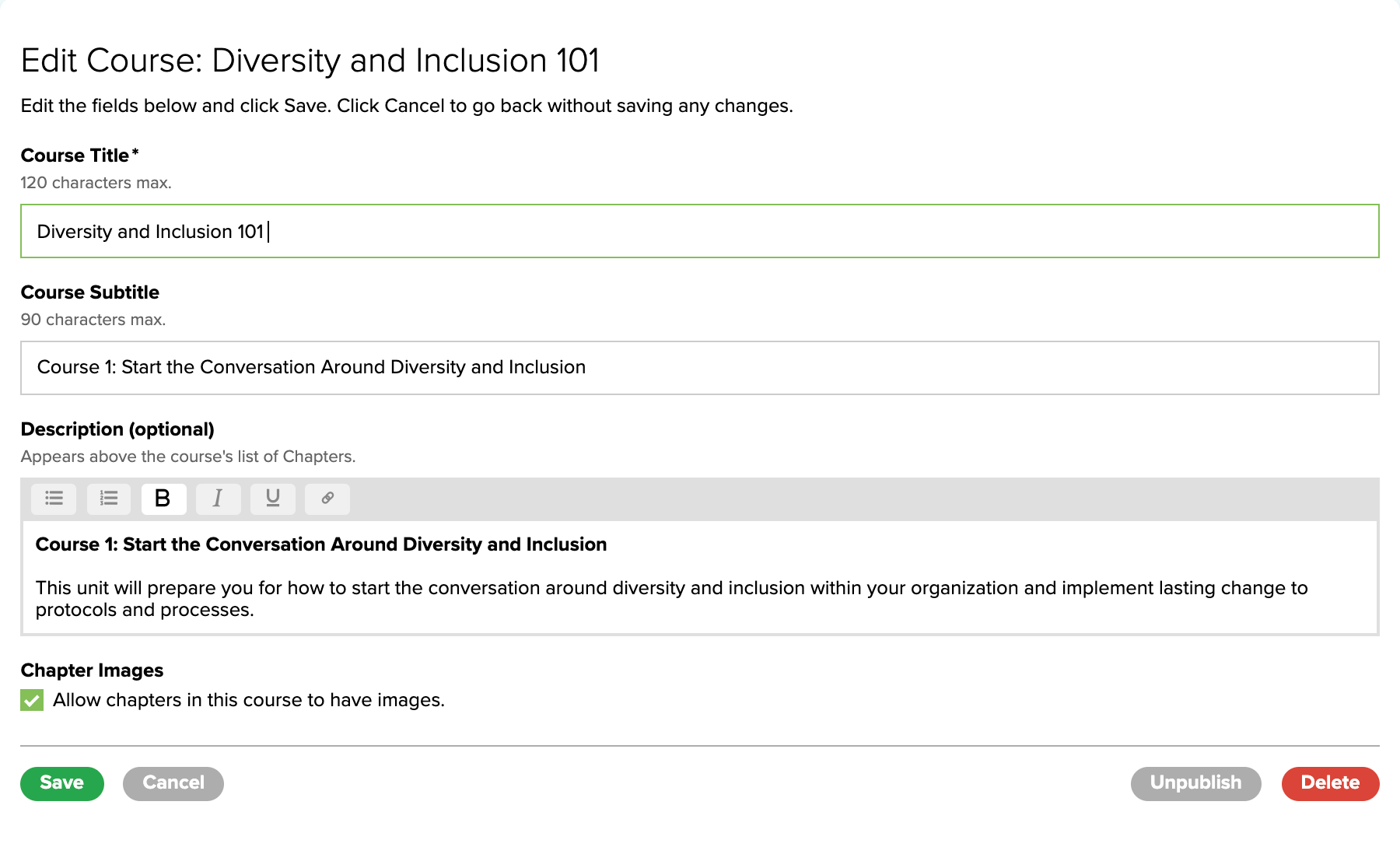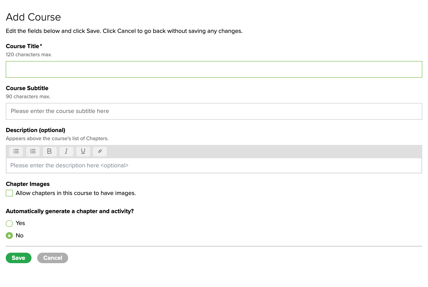 If preferred, you can allow Chapter Images and select if you want to Automatically generate a chapter and activity. Click the Save button. Once saved, the Edit Course page will display, allowing you to add a course image and edit the course details.